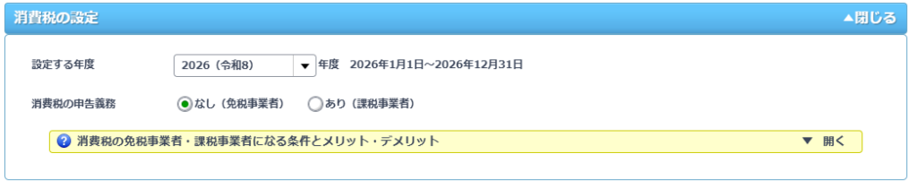 消費税の課税事業者か免税事業者かを設定します。開業初年度は免税事業者となります。